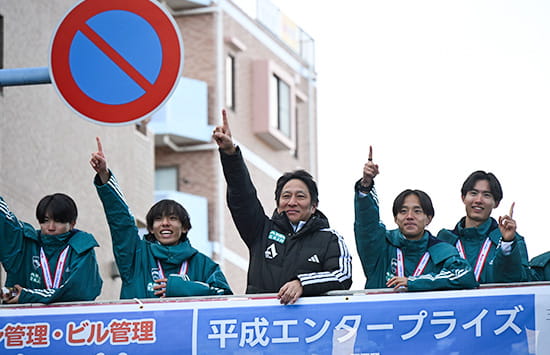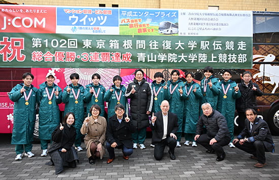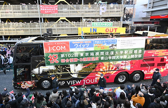 青山学院大学陸上競技部の皆様、箱根駅伝総合優勝3連覇、誠におめでとうございます! 昨年に続き、優勝パレードに当社のオープントップバスをご利用いただきました。